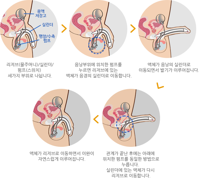 사용시에는 음낭에 삽입된 펌프를 누르면 저장고의 액체가 실린더로 이동하여 발기가 되며, 관계 후에는 펌프의 아랫부분을 누르면 실린더에 있던 액체가 다시 원래의 위치로 이동하여 이완이 됩니다.